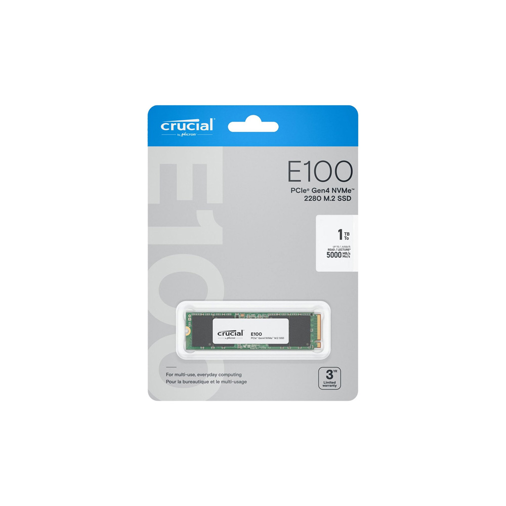 Diseñado en un formato M.2 2280, el Crucial E100 es compatible con una amplia variedad de dispositivos, incluyendo laptops ultradelgadas y PCs de escritorio. Su interfaz PCIe 4.0 x4 y protocolo NVMe garantizan una comunicación rápida y eficiente con el sistema, optimizando el rendimiento general.