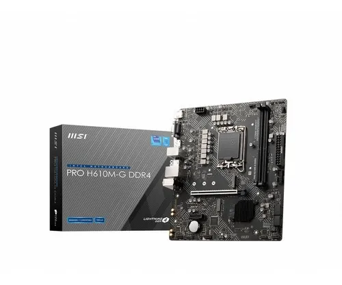 La MSI PRO H610M-G DDR4 es una placa base micro ATX confiable y eficiente, diseñada para equipos de escritorio que requieren rendimiento estable, ideal para tareas de oficina, productividad y uso doméstico. Compatible con procesadores Intel Core de 12ª y 13ª generación (socket LGA 1700), ofrece un balance entre funcionalidad y precio.